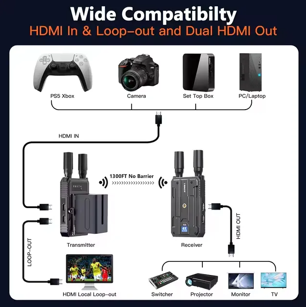Transmissor e Receptor HDMI Sem Fio 4K — VRRIIS WL097P Leve o sinal de qualquer fonte para qualquer tela — sem cabos, sem complicação, até 400 metros de distância.